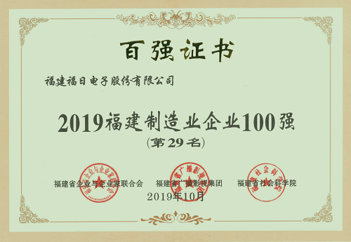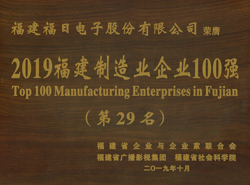2019年10月24日,由福建省企業(yè)與企業(yè)家聯(lián)合會(huì)、福建省社會(huì)科學(xué)院、福建省廣播影視集團(tuán)共同舉辦的2019年福建企業(yè)100強(qiáng)研究發(fā)布會(huì)在福建漳州舉行,福建福日電子股份有限公司入選2019福建制造業(yè)企業(yè)100強(qiáng)。福日電子總裁溫春旺受邀參會(huì)。